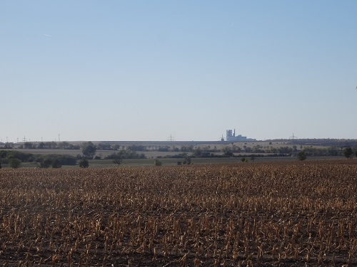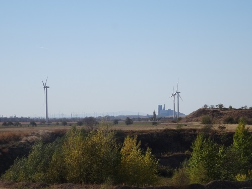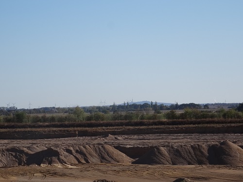 Am Horizont sieht man eine pyramidenartige Erhebung. Das ist die Schutthalde des ehemaligen Kupferbergbaues um Eisleben.
