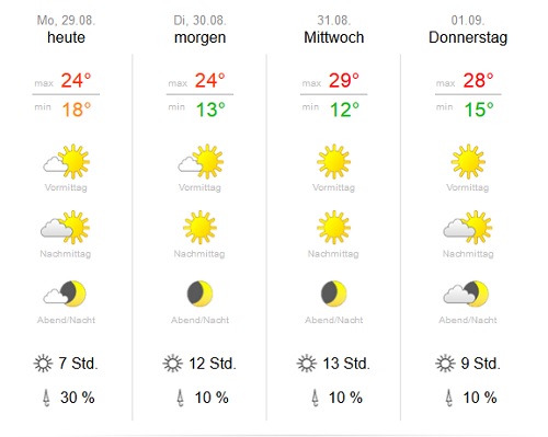 29.08.2016 12:23Gestern hats es ringsrum mal etwas gewittert, nicht mal stark, aber hier ist NICHTS hergekommen ausser etwas Sturmböhen. Und somit bleibt es extrem trocken. Es ist zum verzweifeln. Und es soll auch so bleiben: