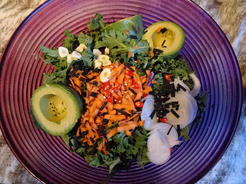 Abends dann einen großen Salat. Den dreiviertel geriebenen Rotkohl sieht man aber grade garnicht!