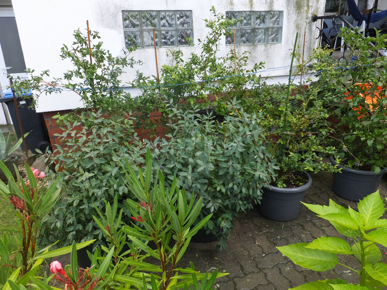 Die Sträucher mittig-links sind Maulbeeren. Haben sogar getragen. Waren gut!