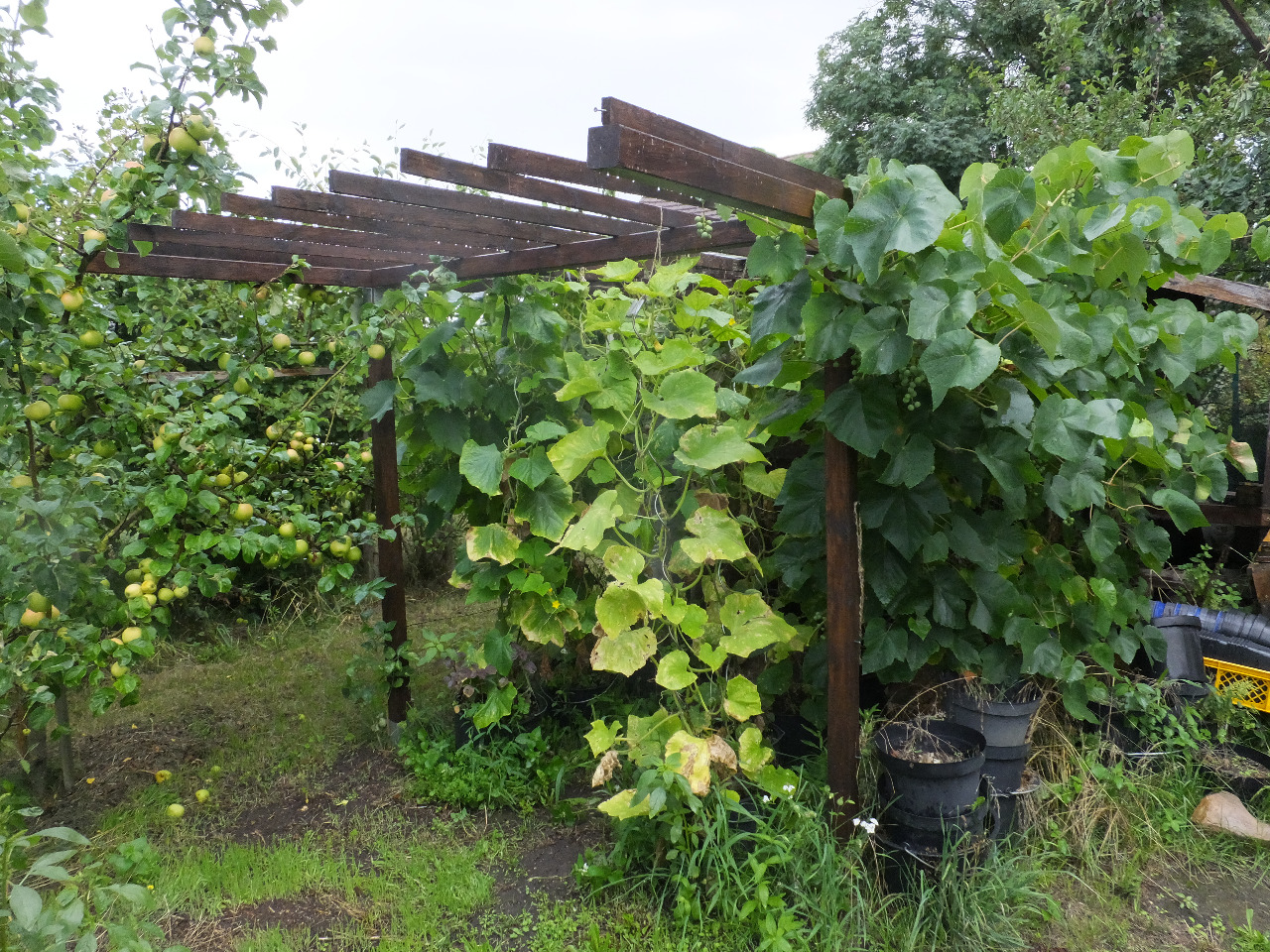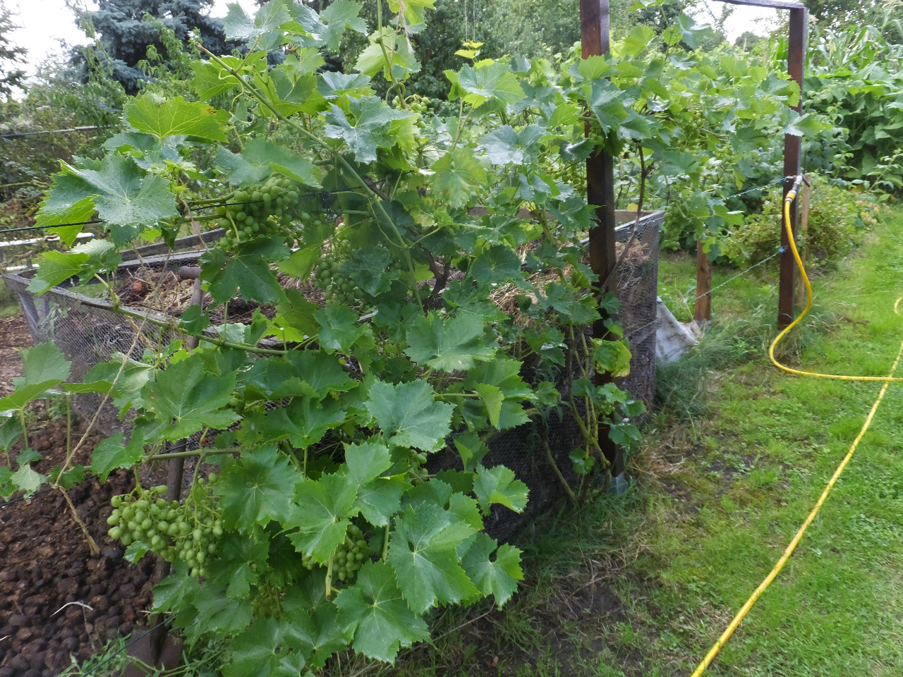 Ich habe aber wirklich jede Ecke mit irgendetwas bepflanzt. Jetzt muss ich an bestimmten Stellen (in den Hecken) schon Sachen rausschneiden, weil es zu eng geworden ist. Aber es ist eben auch nett, wenn überall was wächst, was man essen kann. Ich finde das cool. Hier ein recht überzüchteter Wein...lol