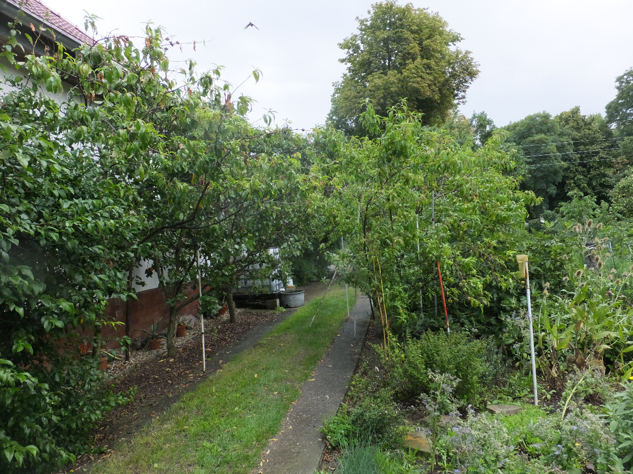 Der Hühnerauslauf. Die können sich wirklich nicht beschweren. Und vielleicht hätte das Huhn sogar überlebt, aber ich habe ein kleines Stück mit einem Netz überspannt, da ist sie drauf geflogen und kam nicht mehr runter, schon hat sie der Marder da erwischt. Es sollte eigentlich die Milane abhalten. Na ja, jetzt habe ich es weggemacht. Für den Milan ist es eh zu dicht bepflanzt. Aber in der Nachbarschaft wurden schon Hühner geschlagen. Aber hier haben sie schon gute Deckung.