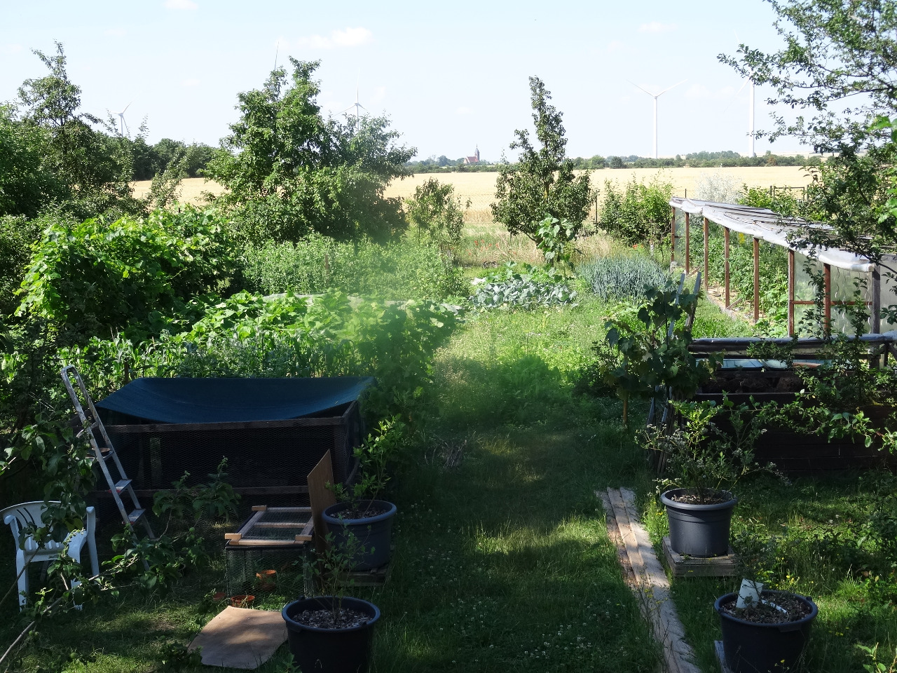 Im Grunde kann man mit so einer Fläche schon vier bis fünf Leute gut mit Eiern, Obst und Gemüse versorgen. Wenn man erkennt, dass man lieber nicht zuviele Früchte essen sollte. Was dann noch fehlt, sind Flächen für die Rinder, Schafe, Enten, Gänse. Dann kann man wirklich eine gute Versorgung aufbauen.
