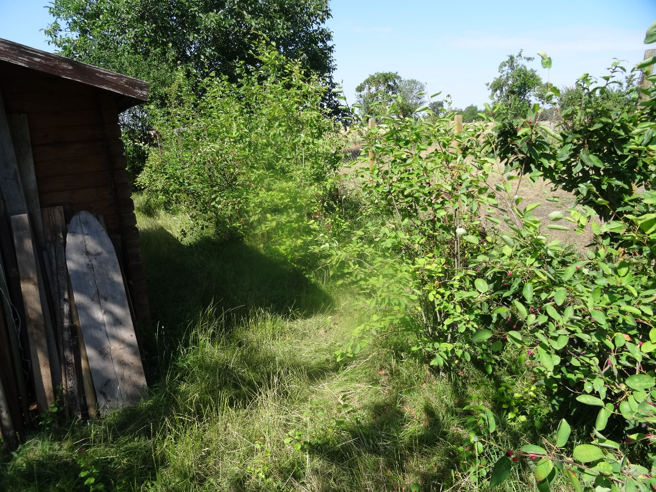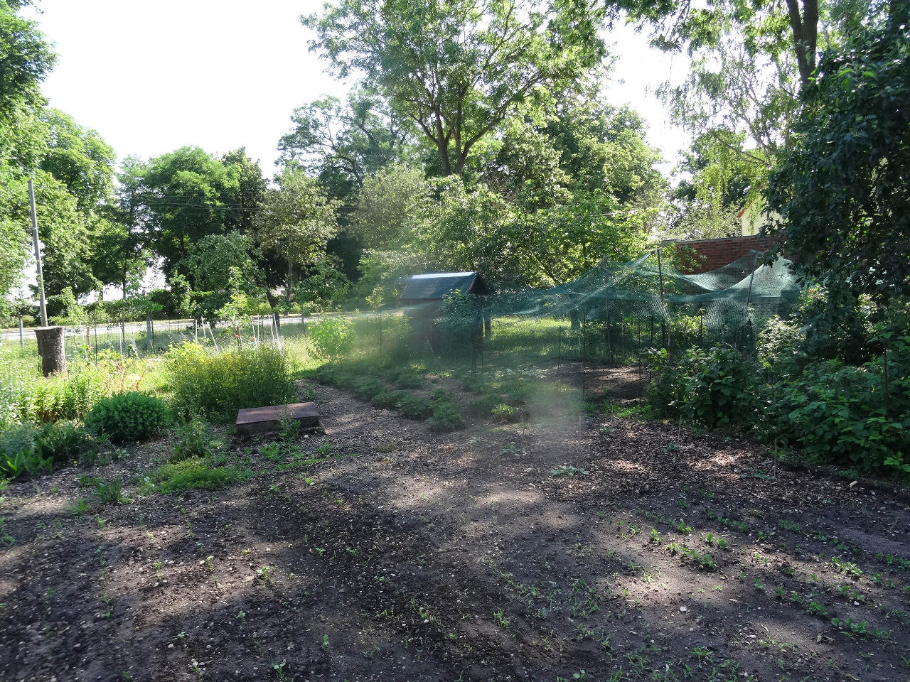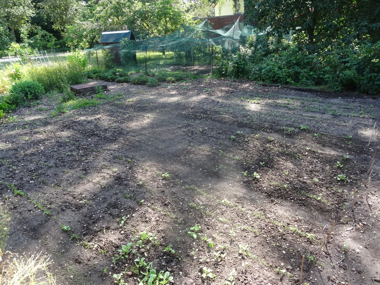 2. Hier habe ich erst im Juni Möhren und rote Beete angesät, vor allem als Hühnerfutter. Ich hatte ein Vlies drüber, so dass sich die Feuchtigkeit hält und es hat gut geklappt. Fast alles ist aufgegangen. Im Hintergrund der Hühnerauslauf.
