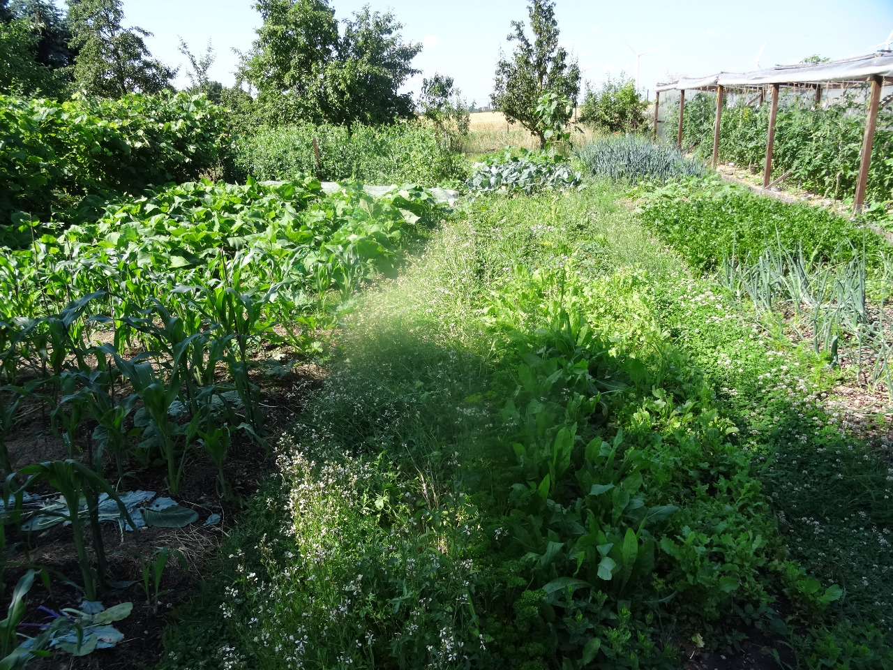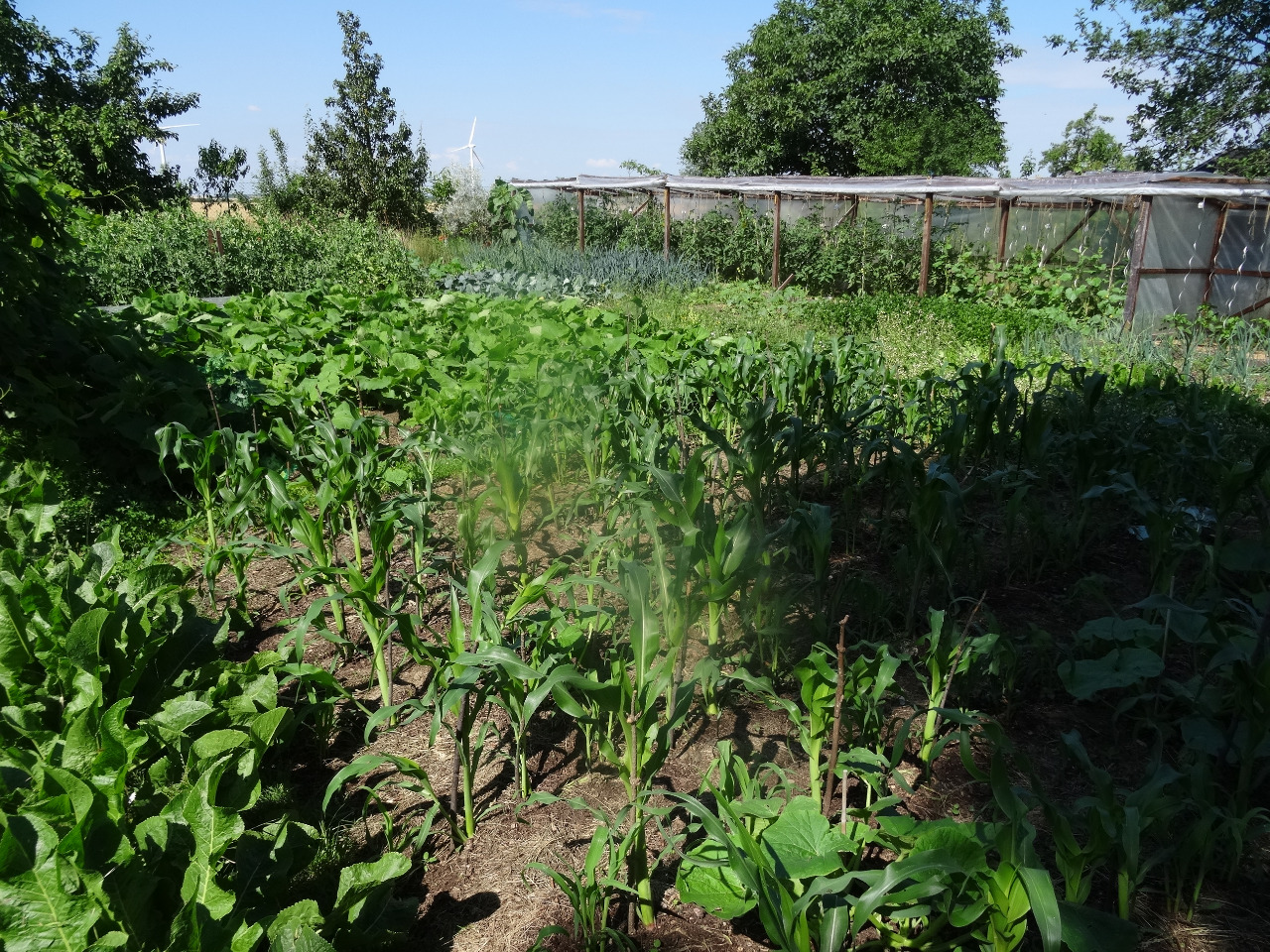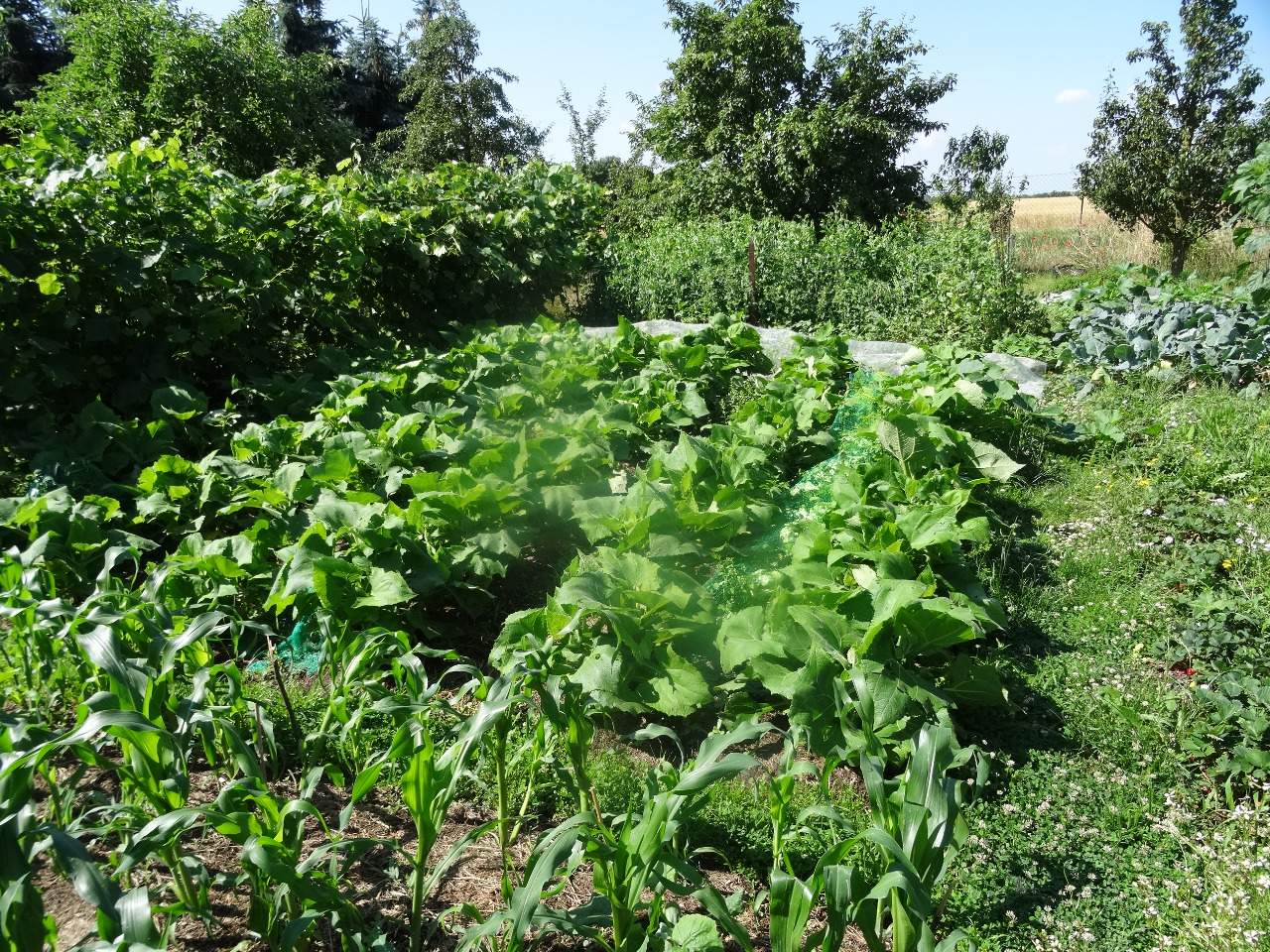 5. Blick in den Garten hinten. Mais, Kürbisse, Yacon, Erbsen, Salate, Tomaten, Melonen, Sellerie, Kohlrabies, Zwibeln, Poree. Und was nicht selber verkonsumiert wird, wird als Futter für die Hühner genutzt. Die mögen auch geriebenen Yacon, wie wir festgestellt haben.