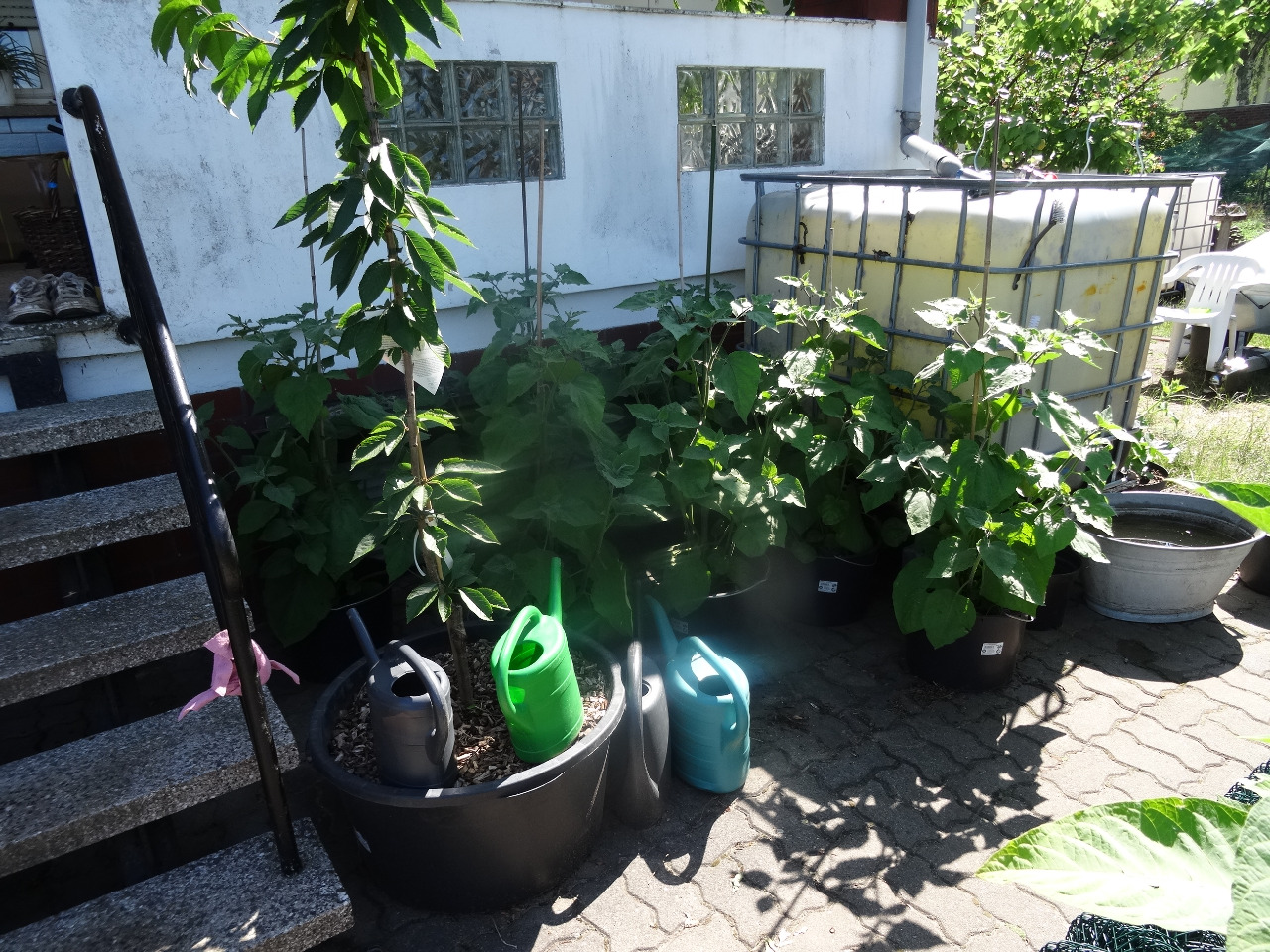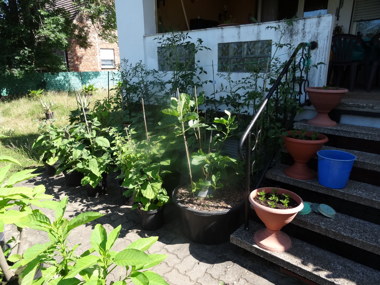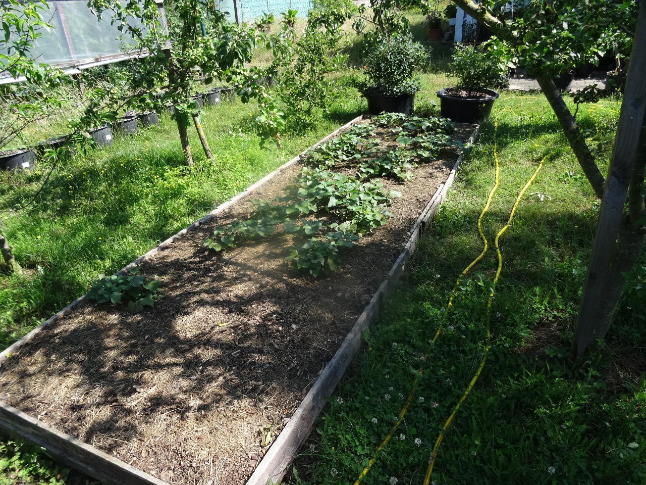 10. Süßkartoffeln und eine Feige, die ich ausgebuddelt und in den Topf gesetzt habe, nachdem ich gemerkt habe, die steht dort, wo ich sie hingepflanzt habe, beschissen. Die trägt immer zum Herbst hin, reift aber selten aus. Heuer kommt die dann ins Gewächshaus, mal sehen, was es dann wird.