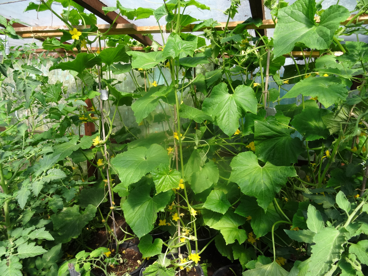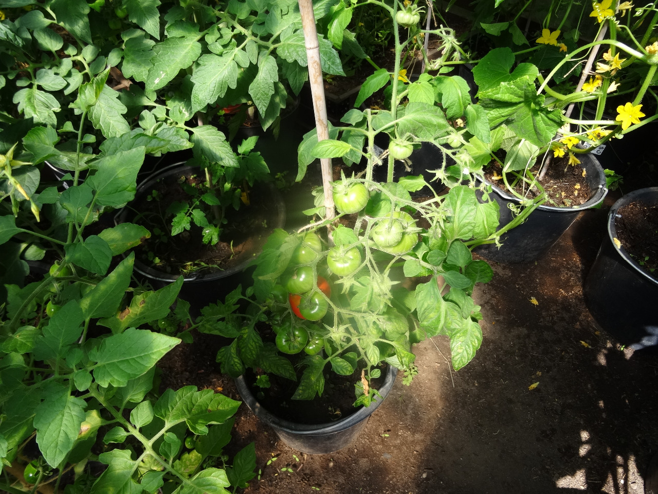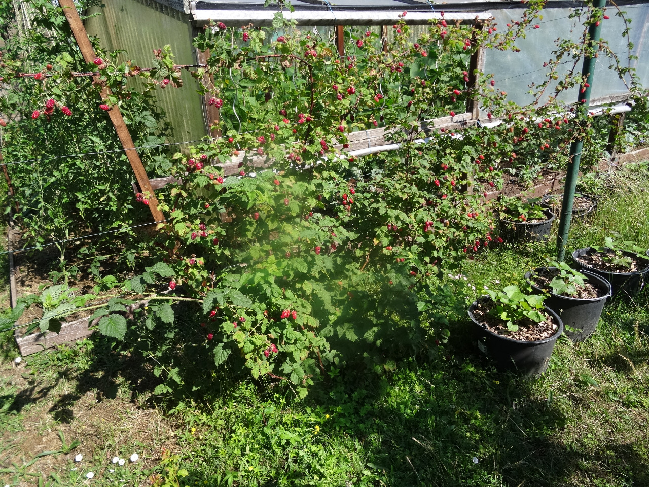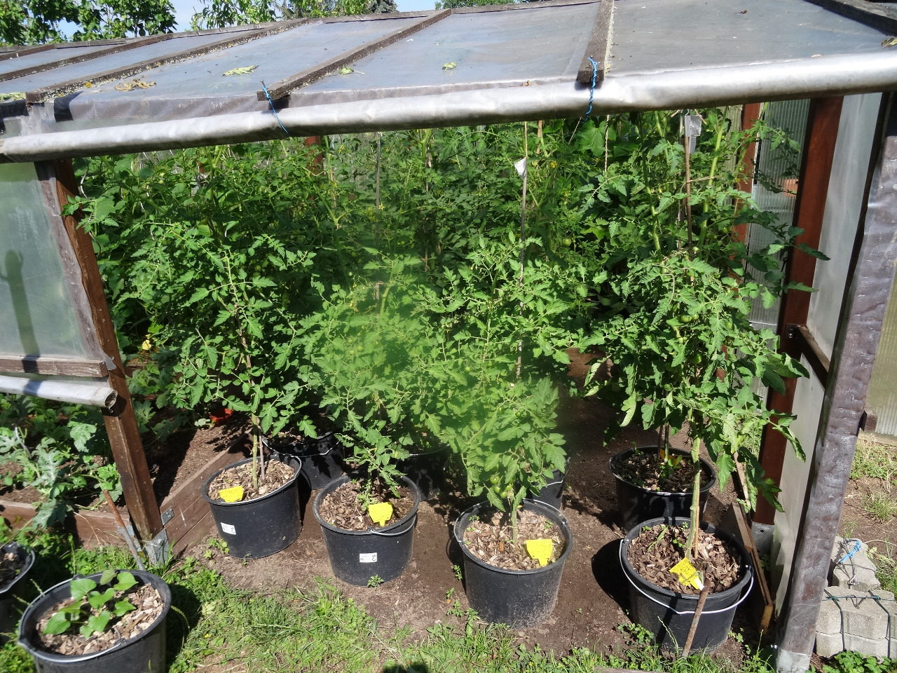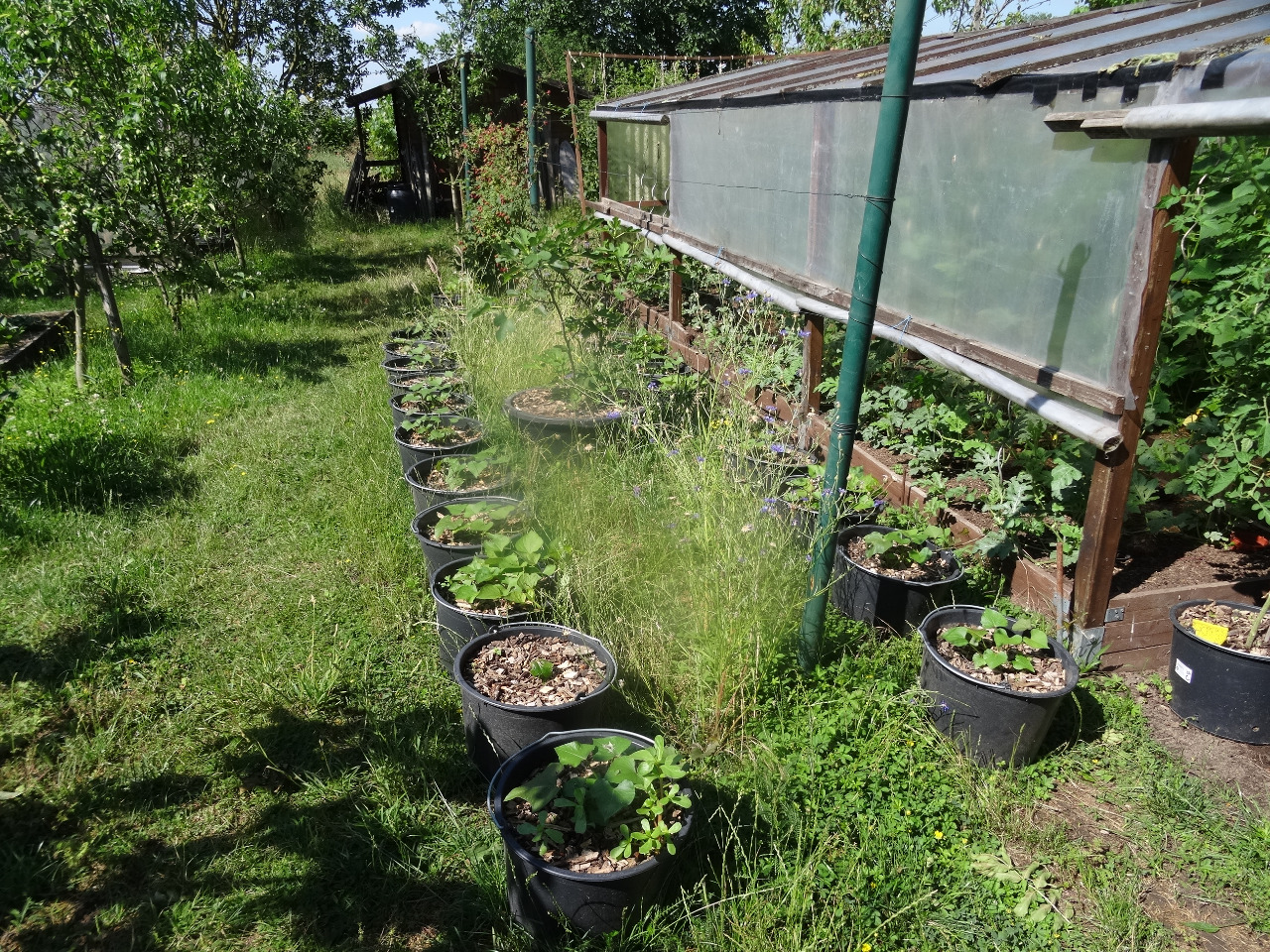 11. Gewächshaus. Ein Kombination aus Töpfen und Beeten.