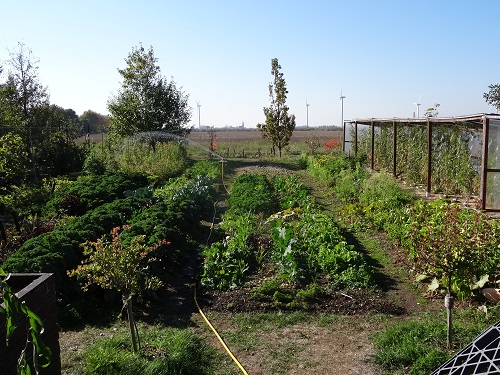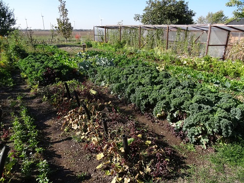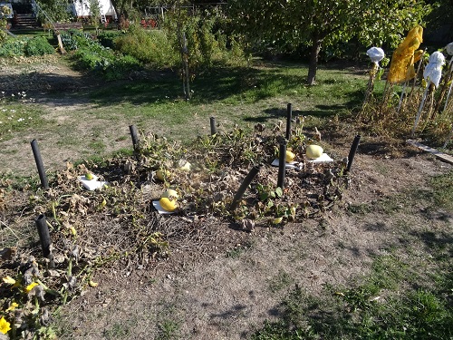 7. Erntezeit bei den Kürbissen. Das Kraut ist schon fast abgestorben und das ist dann der richtige Zeitpunkt, die zu ernten und einzulagern. Die Rohre dienen der Bewässerung. Da kann man ganz gezielt an die Pflanzenwurzeln gießen, ohne das zuviel wegrinnt oder verdunstet.