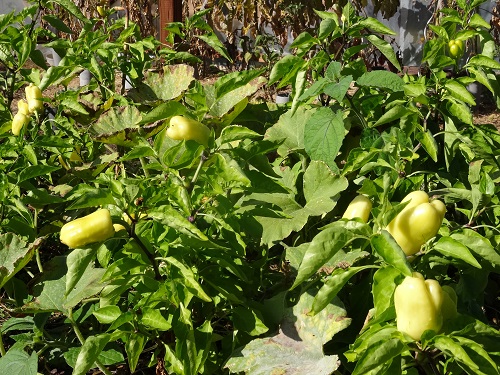 12. Paprikas gibts heuer auch gute. Aber man darf halt nicht fragen, was ich da an Wasser geschleppt habe! Die muss man ja auch gut mit Wasser versorgen, sonst kriegen sie dunkle Flecken ähnlich der Blütenendfäule bei den Tomaten. Also hieß es gießen, gießen, gießen. Tagein, tagaus. Hat sich aber gelohnt. Pepperonis gibt es auch gute.