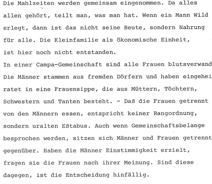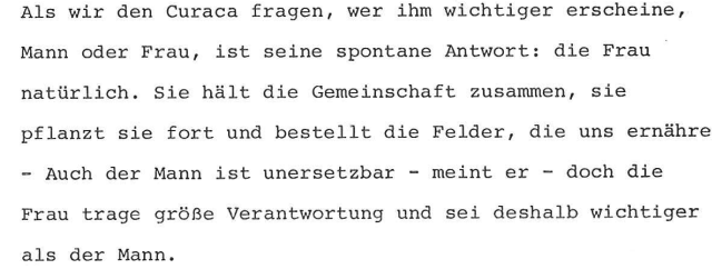 Die Campa, die in den Regenwäldern des Amazonasbeckens leben, konnten zum Teil ihre traditionelle Lebensweise beibehalten. Männer und Frauen verrichten unterschiedliche Arbeiten. Die Frauen sind für den Ackerbau zuständig, während die Männer jagen und fischen. Diese Arbeitsteilung unterliegt jedoch keiner Wertigkeit, denn jede Arbeit ist gleich wichtig, um das Überleben der Gemeinschaft und ihren Zusammenhalt zu sichern. Da kein Überschuß produziert wird und Besitz nicht mit Macht verbunden ist, gibt es auch keine Aufteilung der Gesellschaft in Reiche und Arme, in Herrscher und Beherrschte. Da das Amazonasgebiet reich an Rohstoffen ist und von der Regierung erschlossen werden soll, mußten viele Campa bereits ihr Land verlassen. Wie andere indianische Gruppen, die aus dem Amazonasgebiet vertrieben wurden, sind auch sie in den neu errichteten Siedlungen den westlichen Einflüssen, vermittelt durch Staat, christliche Missionen und Tourismus, ausgesetzt. Der Zerstörung ihres wirtschaftlichen Lebensraums folgt die Zerstörung der kulturellen Werte. Hauptbetroffene sind die Frauen, denn sie nehmen in der patriarchalisch organisierten Gesellschaft, in der individuelle Leistung mehr bedeutet als die Solidarität der Gruppe, eine untergeordnete Stellung ein.
