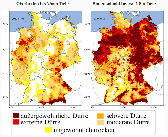 Von Schwankungen abgesehen, war die achtmonatige extreme Dürre von 2018 im norddeutschen Tiefland und großen Teilen Mitteldeutschlands weitaus am stärksten ausgeprägt. In den Bundesländern Niedersachsen und Brandenburg kämpften die Feuerwehrleute gegen verheerende Wald- und Moorbrände. Auch im vergangenen Winter fielen die Niederschläge zu gering aus.