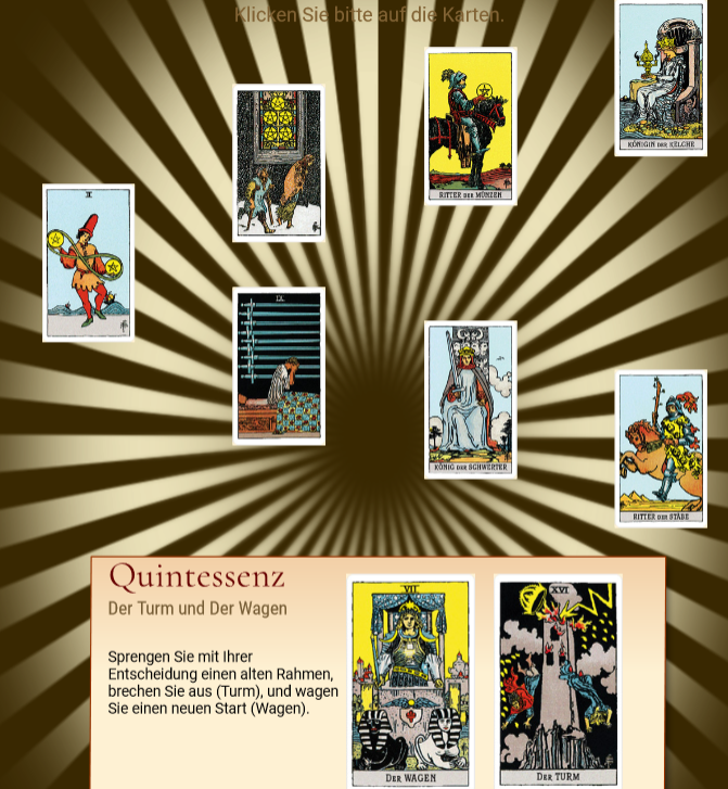 Aber den Ausschlag hat dann die Quintessenz gegeben: Der Wagen und Der Turm. Und was das bedeutet, steht ja da.