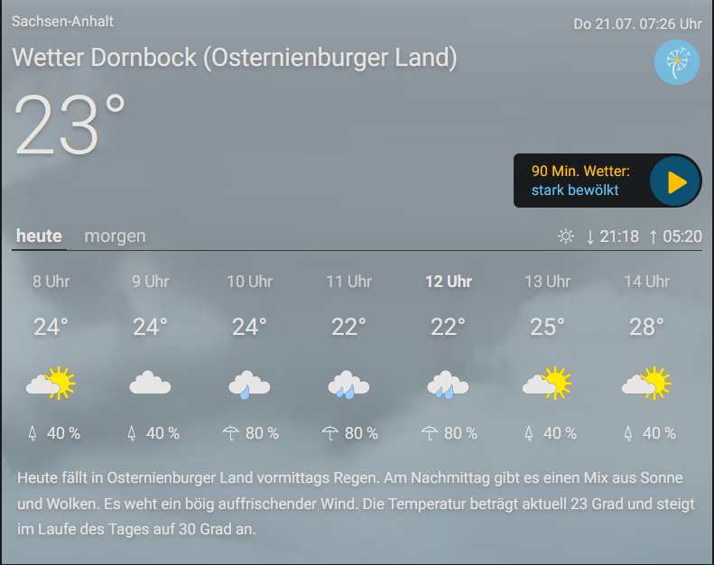 Heute morgen habe ich mal geschaut und siehe da, 80% Regenwahrscheinlichkeit und im Text dann "Heute fällt im Osternienburger Land vormittags Regen."