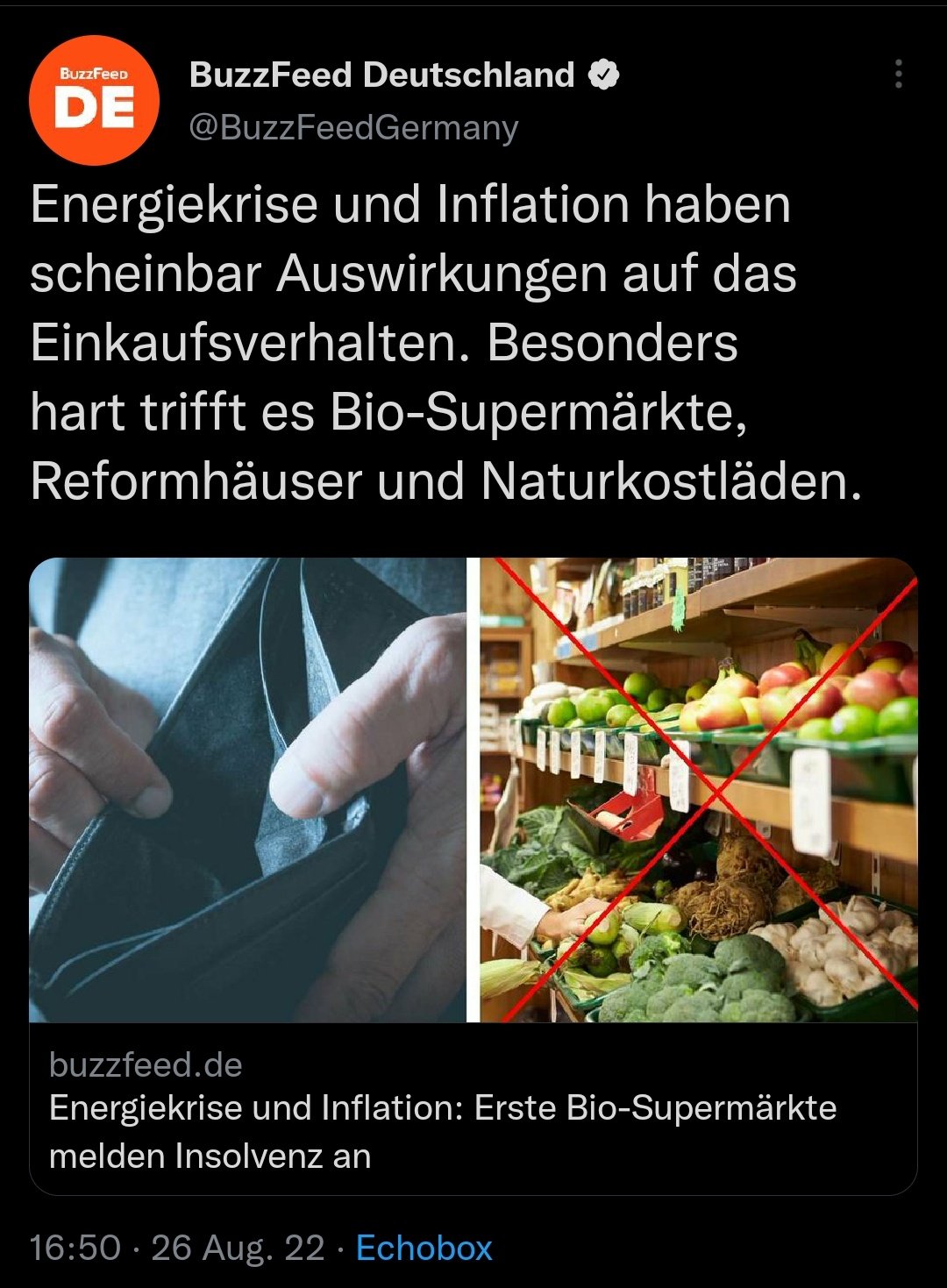 Für mich sieht es so aus, als ob man hier das Chaos, die Revolution unbedingt anfachen möchte. Und weil das Gas nun so teuer wird, gehen die Leute nicht mehr in den Bioladen und gehen wieder dazu über Schrott zu konsumieren.