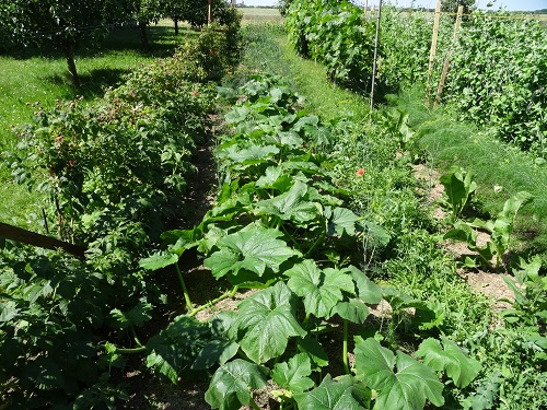 Daneben ein Beet mit steirischem Ölkürbis. Der schmeckt recht lecker! Mal sehen, ob es was wird. Dann noch eine Zeile Rucola, der von alleine kam und Meerettich.