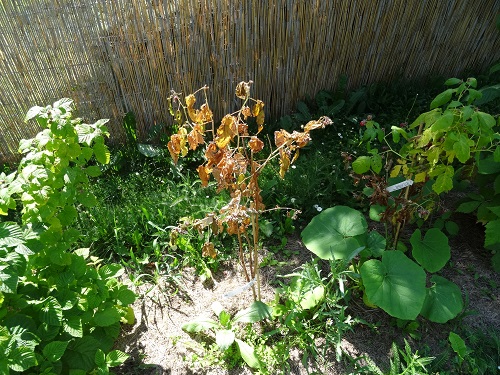 Aber es gibt auch Verluste: hier ist eine Herbst-Himbeere eingegangen. Auch drei Melonenpflanzen sind vertrocknet. Ich glaube, es waren Gießfehler. Jedenfalls waren die Wurzeln weggefault. Wahrscheinlich weil wir zuviel gegossen haben. Na gut, das sind so Fehler, die muss man mal machen. Mal schauen, wieviele am Ende überleben. Das muss man alles erstmal auch ausprobieren, wie dass alles am besten funktioniert.