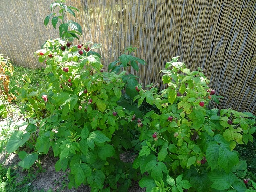 Hier noch die Herbsthimbeeren, die nun schon im Frühsommer Früchte tragen.