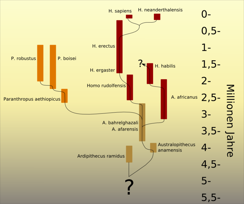 Wenn man sich den Stammbaum anschaut, dann sieht man, dass zwischen 4.0 und 2.5 Mio Jahren eine Vielzahl an Arten entdeckt wurden, die möglicherweise die direkten Vorfahren der Menschen sind.