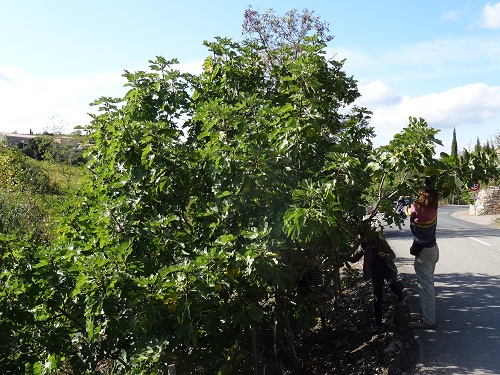 Wir haben dann in Montpellier bei einem Freund von Jörg übernachtet. Anderntags ging es weiter. Reiseziel war Perpignan, genau gesagt das ehemalige Weingut „Mas Depres“, wo derzeit eine Rohkostgemeinschaft entsteht. In Narbonne waren wir nochmal einkaufen und von dort ging es durchs Hinterland über das wunderschöne Tal von Tautavel nach Perpignan. Die Landschaft ist ja wirklich atemberaubend. Und natürlich haben wir noch einen Feigenbaum auf dem Weg gefunden.