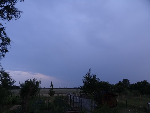 Gerade eben stand in südwestlicher Richtung ein Gewitter für mehr als zwei Stunden am Horizont. Es stand einfach da und hat dort wo es stand, alles rausgehauen, statt zu ziehen und den belebenden Regen zu verteilen. Und so bekommen manche Gebiete nichts, und manche mehr als sie verkraften können.